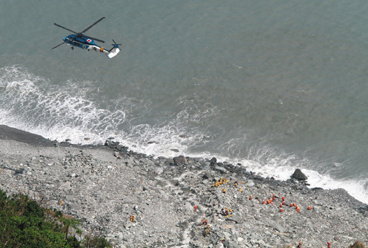 部署在崖頂?shù)摹跋朗稹碧厮讶藛T,25日上午不放過(guò)每一道山間裂隙,大隊(duì)人馬驚險(xiǎn)自300英尺以的斷崖垂降而下,在頭頂還有土石不斷崩落的險(xiǎn)境里,一英尺一英尺地往下確認(rèn),人員橘色操作服在慘白的土石崩落地形間十分明顯。一位特搜人員垂降到海際確認(rèn)積土深度,一點(diǎn)橘衣身后就是巨大的土石崩落群,形成強(qiáng)烈對(duì)比。
