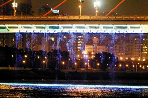 最適合夜間欣賞的大佳展區(qū),25日夜飄起毛毛雨,但號稱亞洲最大的戶外數(shù)位水幕未受影響。各式花博文字、圖形隨一波波水幕傾瀉而下,基隆河岸長1250米的堤壁更可見夜光黑面琵鷺、油桐花閃閃發(fā)光,民眾都撐傘、穿起雨衣在河畔靜靜瀏覽河景。