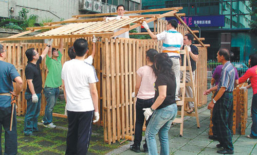 中新網(wǎng)10月27日電 據(jù)臺灣《聯(lián)合報》報道,臺灣房價居高不下,許多人被迫一生當“房奴”。臺藝術(shù)家盧建銘、許淑真要提供平民技術(shù),示范用25分鐘蓋好6坪(1坪約是3.3平方米)木房,把建屋權(quán)從建商交還一般人,也讓房子從“私人昂貴商品”還原成“眾人共生共食處所”,這也將是臺灣第一個“現(xiàn)場演出”的建屋行動。