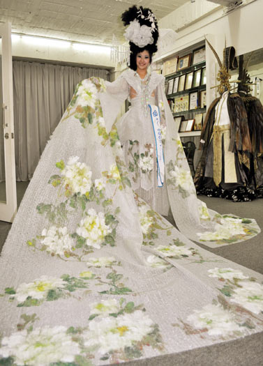 2010全球生態(tài)旅游小姐決賽24日在南京舉行,數(shù)十名佳麗參賽,臺灣實(shí)踐大學(xué)服裝設(shè)計(jì)系學(xué)生林育如,身著一襲以臺北花博萬華區(qū)區(qū)花白牡丹為意象設(shè)計(jì)的服裝參賽,驚艷全場,拿下最佳生態(tài)旅游小姐獎(jiǎng),林育如26日載譽(yù)返臺,在高雄家鄉(xiāng)展示參賽服裝。