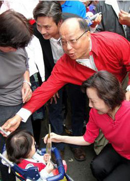 市場內民眾看到胡志強夫婦與金溥聰一起出現(xiàn),都非常興奮,3人努力緊握每1雙手,不少攤商主動送上粽子、包子、好彩頭等給胡志強,還不時傳出“凍蒜(當選)”的聲音,祝福胡志強高票當選。