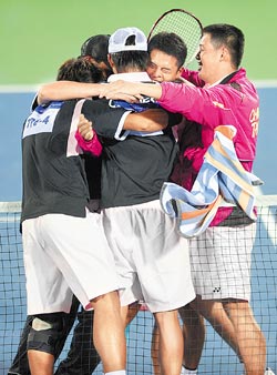 中新網(wǎng)11月15日電 據(jù)臺灣《中國時(shí)報(bào)》報(bào)道,中華臺北亞運(yùn)代表團(tuán)在廣州亞運(yùn)會第二天收獲豐碩,上屆在金牌戰(zhàn)失手的軟式網(wǎng)球男子團(tuán)體賽,昨日借著林鼎鈞與劉家綸在決勝點(diǎn)演出精采逆轉(zhuǎn),以二比一后來居上擊敗日本隊(duì),替中華臺北代表團(tuán)奪得廣州亞運(yùn)首金。