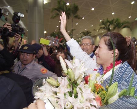 楊淑君22日晚18時(shí)50分搭機(jī)隨隊(duì)返臺(tái)。從步出登機(jī)門,到入境大廳的過程中,不少旅客高喊楊淑君加油,也有免稅店的店員、入出境旅客頻頻向她比出V字型勝利的手勢(shì)。