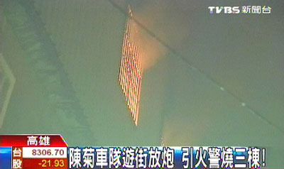 據(jù)報(bào)道,陳菊23日到高雄縣的永安、彌陀和梓官等鄉(xiāng)鎮(zhèn)車隊(duì)掃街拜票,傍晚17點(diǎn)多行經(jīng)梓官鄉(xiāng)光明路時(shí),支持者和車隊(duì)沿途放沖天炮,突然有民眾目擊,沖天炮飛竄到一家電子專賣店三樓的鐵皮屋,火勢(shì)并且迅速延燒到左右兩邊的民宅三樓,消防局17點(diǎn)20分接獲報(bào)案后,出動(dòng)7輛消防車前往搶救,17點(diǎn)58分控制火勢(shì),18點(diǎn)15分將火勢(shì)完全撲滅,幸好沒(méi)有民眾受傷,不過(guò),三間民宅的三樓頂都已經(jīng)被燒毀,陳菊競(jìng)選總部事后表示,會(huì)協(xié)助修復(fù)。