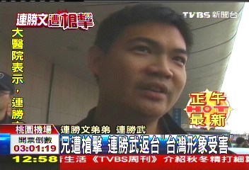 中新網(wǎng)11月27日電 據(jù)臺(tái)灣TVBS報(bào)道,在臺(tái)灣“五都”選前最后一天,國(guó)民黨榮譽(yù)主席連戰(zhàn)之子連勝文遭到槍擊。27日上午11點(diǎn)55分,連勝文的弟弟連勝武從香港飛抵臺(tái)灣。他說(shuō),知道這樣的事情,他很替哥哥心痛。
