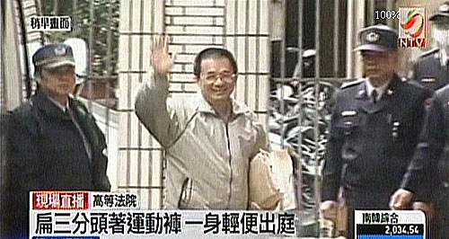 陳水扁手上拿著黃色牛皮紙袋裝的卷宗,露出微笑并向在場媒體揮手致意,在戒護(hù)人員陪同下快速步入高院。