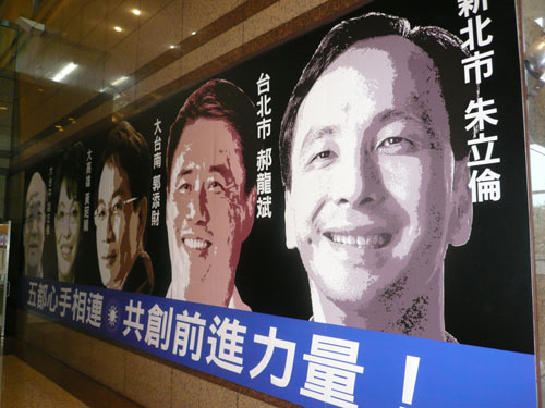 國(guó)民黨當(dāng)初為因應(yīng)“五都”選舉,特別在中央黨部1樓大廳兩側(cè)張貼巨型的“五都”市長(zhǎng)候選人看板,訴求“‘五都’心手相連,共創(chuàng)前進(jìn)力量!笨窗迳,新北市長(zhǎng)候選人朱立倫、臺(tái)北市長(zhǎng)候選人郝龍斌、臺(tái)南市長(zhǎng)候選人郭添財(cái)、高雄市長(zhǎng)候選人黃昭順、臺(tái)中市長(zhǎng)候選人胡志強(qiáng)的照片一一呈現(xiàn)。