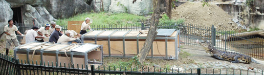 由于無(wú)人敢接近河口鱷,保育員采繩索硬拖拉法,八名保育大漢像拔河一般,將河口鱷硬拉進(jìn)長(zhǎng)鐵籠內(nèi)。隨后又以同樣模式,再硬拖重約一百三十公斤母鱷進(jìn)入另一鐵籠,以吊車先后安移入新居,與凱門鱷隔欄而居。