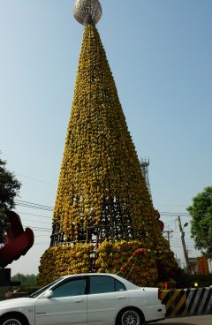 據(jù)臺灣“中廣新聞網(wǎng)”報道,數(shù)量龐大的橙子果海,堆聚在云林古坑知名的綠色隧道景點周邊,映照一片金黃意象,極為壯觀。一株高達五層樓、號稱全世界最大的橙子圣誕樹,就矗立于綠色隧道入口處熱情迎賓,吸引民眾爭相拍照留念。