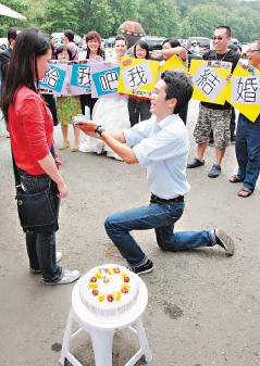 據(jù)臺灣《聯(lián)合報》報道,60對新人昨天齊聚蔣介石銅像園區(qū)參加“穿越時空遇到愛”集體結(jié)婚典禮。新人們牽手步過鵲橋進入會場,個個拼創(chuàng)意,有舉牌助婚團,還有頂著爆炸頭的新郎倌,連穿自由車車裝新人都搶著亮相,讓園區(qū)里頭喜氣洋洋。