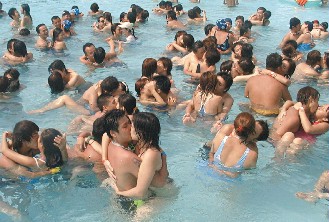 中新網(wǎng)7月30日電 臺(tái)北縣八里鄉(xiāng)八仙水上樂(lè)園4年前舉辦“愛(ài)的啵!逼呦η槿斯(jié)活動(dòng),吸引百余對(duì)情侶在水中忘情擁吻。今年8月7日“七夕”要挑戰(zhàn)更高難度,舉辦“水底接吻競(jìng)賽”,第一名可獲得水中數(shù)碼相機(jī)1臺(tái)。