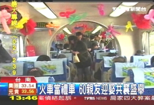 中新網(wǎng)12月8日電 臺(tái)灣臺(tái)南有一位鐵道迷,為了要完成在火車上結(jié)婚的夢(mèng)想,自掏腰包花了4萬(wàn)多元新臺(tái)幣,包下臺(tái)鐵行政專車,載著60多名的親友,從樹林迎娶新娘回臺(tái)南林鳳營(yíng)站;疖嚮槎Y堪稱臺(tái)灣史上頭一遭,月臺(tái)上吸引很多乘客目光,也造成轟動(dòng)。