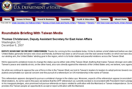 柯慶生首先發(fā)表一份聲明說(shuō),美國(guó)曾私下和公開(kāi)表明反對(duì)“以臺(tái)灣為名義加入聯(lián)合國(guó)的公投”,因?yàn)槊婪秸J(rèn)為這代表追求單方面改變現(xiàn)狀,違反陳水扁初次就職演說(shuō)的承諾,包括不更改“國(guó)號(hào)”和不會(huì)推動(dòng)“統(tǒng)獨(dú)公投”。