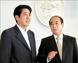 王金平(右)十六日應邀在日本演講,在演講會前與安倍晉三(左)會晤