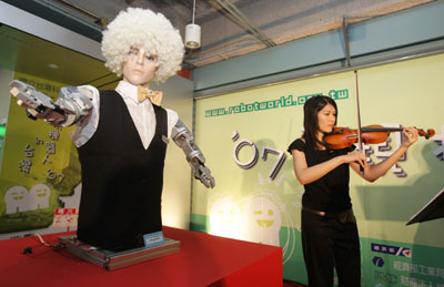 其中,有智慧機(jī)器狗透過掌聲次數(shù)的聲控技術(shù),可以做出奔跑、休息等擬真的動(dòng)作。還有樂團(tuán)演奏家看著機(jī)器人的指揮,彈拉出一首首美妙的音樂。