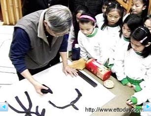 蓋上落款,輕松完成“鼠來(lái)寶”字帖,劉校長(zhǎng)手中的抹布彷佛就像是化身毛筆一般,一筆一劃勾勒出漢字的力與美。一旁的小朋友看得目不轉(zhuǎn)睛,搶著上場(chǎng)親自實(shí)驗(yàn)一番。
