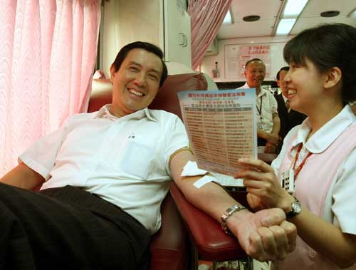 報道說,經(jīng)常捐血的馬英九今天捐出兩袋血,共五百c.c.,捐完血并愉快地向記者說捐血很快樂,并和捐血車工作人員合影留念。馬英九累積已捐出一百七十八袋血。
