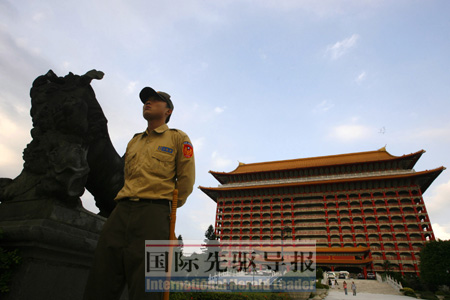 國際先驅(qū)導(dǎo)報特約撰稿沈宇哲發(fā)自上海 在臺北,有一座中國宮殿式建筑,它高達14層,隨處可見七彩畫梁、丹朱圓柱和琉璃金瓦。依傍基隆河、高聳于劍潭山之腰的它,正是海協(xié)會會長陳云林此次赴臺下榻的臺北圓山大飯店。