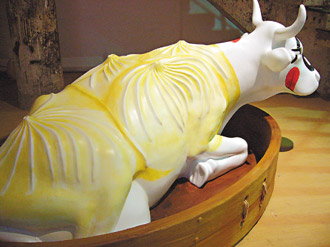 臺灣的奔牛節(jié)開放創(chuàng)作現(xiàn)場(華山創(chuàng)意園區(qū)),最近每隔一段時間,現(xiàn)場就會換上一批花色不同的牛,有時還可看到正在創(chuàng)作的藝術(shù)家,如莊普現(xiàn)正創(chuàng)作“三只鹿”,讓牛披上了梅花鹿的皮,就有點“指牛為鹿”的味道。洪天宇的牛,內(nèi)臟器官全部外露。