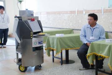 據(jù)臺灣媒體報道,這部點(diǎn)餐服務(wù)機(jī)器人,身高一百五十厘米,臺灣勤益科大電子系黃國興教授帶領(lǐng)四名同學(xué)以一年時間完成。機(jī)器人有臉部辨識系統(tǒng),有客人上門,就會主動打招呼,機(jī)器人會查看哪里有空位,規(guī)劃最佳路徑,帶領(lǐng)客人到達(dá)指定桌號,再透過觸控、聲控的方式進(jìn)行點(diǎn)餐,并將點(diǎn)好的菜單利用無線網(wǎng)絡(luò)傳送到柜臺、廚房。