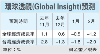 中新網(wǎng)2月18日電 臺(tái)灣《經(jīng)濟(jì)日?qǐng)?bào)》18日頭條新聞報(bào)道說(shuō),環(huán)球透視(Global Insight)剛發(fā)布最新經(jīng)濟(jì)預(yù)測(cè),再度下修臺(tái)灣今年經(jīng)濟(jì)成長(zhǎng)率,并下修到負(fù)成長(zhǎng)2.0%,甚至比全球經(jīng)濟(jì)負(fù)成長(zhǎng)1.2%還差。