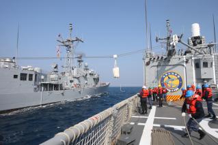 在海上整補(bǔ)科目時,納編的班超軍艦?zāi)M回報機(jī)件故障,支隊下令由岳飛軍艦緊急支持料件,兩艘軍艦在等速并航中,實(shí)施高線傳遞演練。