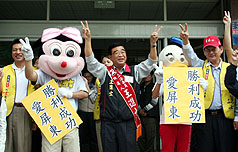 國民黨“立委”參選人羅世雄抽中簽王,也由吉祥物陪同高喊“一定當選”造勢。