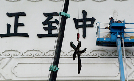 臺灣當局拆除中正紀念堂“大中至正”牌樓內外側共八個字,陳水扁甚至以太監(jiān)李蓮英來比喻:“被割掉了,還能裝回去嗎?”圖為“大”字被拆下時的情況。記者游順然/攝影