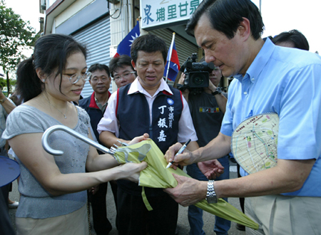 國民黨2008年“大選”參選人馬英九拜訪基層,熱情民眾拿出雨傘要求簽名,傘尖卻差點戳到小馬哥的“重要部位”,留下這一幅尷尬畫面。記者丁志寬/攝影