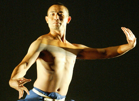 《男人跳舞》登上臺(tái)北舞臺(tái),從父親的關(guān)系、女性特質(zhì)、暴力、變身及性別等主題出發(fā),剖析多變與復(fù)雜的男性認(rèn)同議題。圖為獨(dú)舞的泰國(guó)古典面具舞者皮歇•克朗淳。記者林秀明/攝影