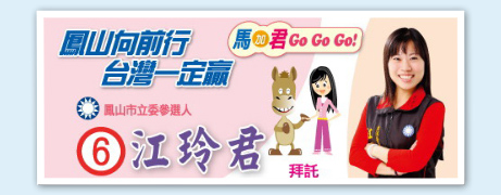 32歲的江玲君是高雄縣現(xiàn)任縣議員,三年前的國民黨主席選舉,江玲君接受馬英九團隊的熱情招手,以行動力挺馬英九,從此江玲君被視為“馬家軍”的一員,此次也打出“馬加君”形象牌,爭取更上層樓機會。