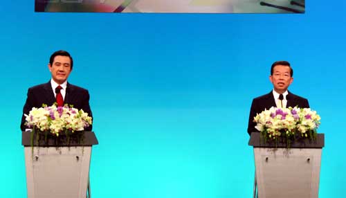 晚間七時(shí)許,馬謝兩人一前一后抵達(dá)臺(tái)北公共電視臺(tái)。馬英九著深藍(lán)色西裝,系深紅色領(lǐng)帶;謝長廷著藍(lán)黑色西裝,系淺黃色領(lǐng)帶,兩人的太太今天均未陪同。