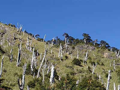從塔塔加到排云山莊,最壯觀的景色之一,可能就是白木林了。位于距塔塔加步道口約5公里處之白木林,從觀景臺(tái)往山坡上望去,盡是一棵棵白色、孤寂矗立的枯木,白木林是森林遭受火焚后所殘余下來(lái)的枝干,經(jīng)過(guò)風(fēng)吹、日曬及雨淋等作用,樹皮逐漸剝落,只剩下白色木質(zhì)的一種特殊景觀。白木林主要樹種為冷杉和鐵杉,其中鐵杉較多,樹干挺直者為冷杉,樹干彎曲多分枝者為鐵杉。