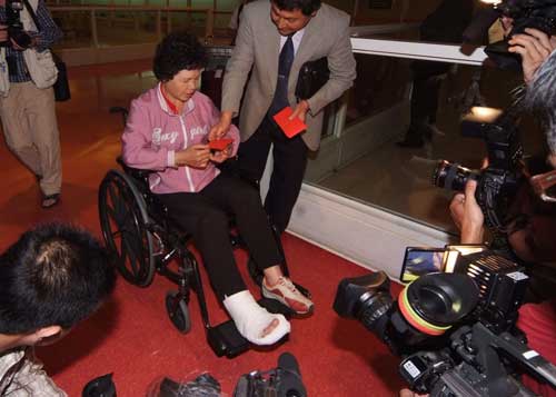 臺中乾隆旅行社團員在四川發(fā)生強震時,遭落石擊中腳踝,十五日凌晨坐輪椅返臺,所幸沒有生命危險,旅行社也送上紅包。(“中央社”圖)