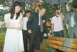 演講結(jié)束,翁帆慢步走上講臺(tái),大方地與與楊振寧站在一起,與簇?fù)淼膶W(xué)生合照,然后一起開心地手牽手前去為諾貝爾大師椅揭幕。這時(shí)天空飄起細(xì)雨,“小心啊,地滑!”翁帆提醒楊振寧,兩人臉上帶著笑意,也卸除了大學(xué)師生對(duì)“大師”兩個(gè)字的恐懼。