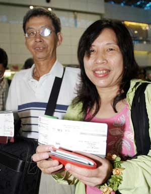 兩岸周末包機(jī)四日啟動,首班由臺北飛往上海的華航班機(jī)第一位報(bào)到旅客沈美珠(右)和陳進(jìn)興(左),興奮展示登機(jī)證。 “中央社”圖