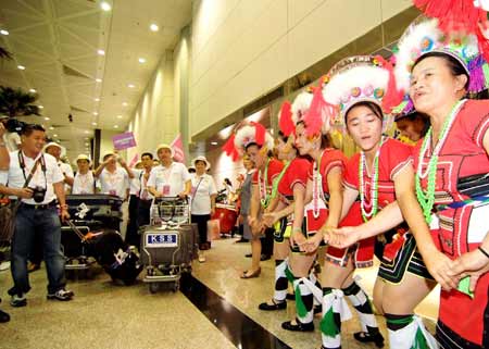 兩岸周末包機(jī)啟動,大陸來臺觀光首發(fā)團(tuán)四日抵達(dá)桃園機(jī)場后,受到南投縣少數(shù)民族的載歌載舞歡迎,也成為觀光客目光焦點(diǎn)。 “中央社”圖
