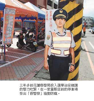 警察立牌,是出自新竹縣警局督察長趙成之的點子,四年前他擔(dān)任桃園縣警局大溪警分局分局長時,自己上陣當(dāng)模特兒,制作手握霰彈槍的立像,擺在轄區(qū)銀行門口,讓民眾印象深刻。