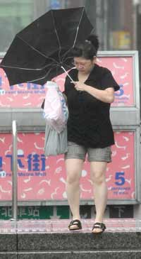 “鳳凰”臺風來襲,臺北市街頭不時出現(xiàn)強風讓路過行人手中的雨傘直接開花。
