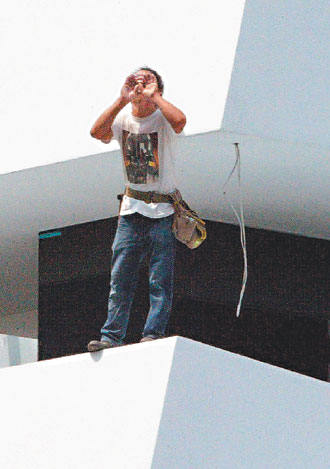 一名莊姓裝潢工人昨天站在臺北市信義路五段陳水扁“寶徠花園廣場”住宅旁的樣品屋屋頂,對著陳水扁所住豪宅,高喊“阿扁你對不起臺灣人民”,還要他把貪污的錢給還出來!(圖片來源:臺灣《聯(lián)合報》)