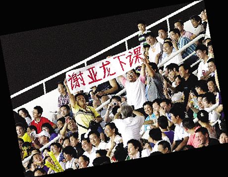 謝亞龍作為中國(guó)足協(xié)的一把手,在其任期內(nèi)也是語(yǔ)錄翻新不斷,從亞洲兵敗的吟詩(shī):“恨不抗日死,留作今日羞。國(guó)破尚如此,我何惜此頭”到女足奧運(yùn)無(wú)緣四強(qiáng)之后說(shuō):“女足該練練叉腰肌!辈贿^(guò),語(yǔ)錄再多也不能當(dāng)球踢,國(guó)足和國(guó)奧糟糕的戰(zhàn)績(jī)讓中國(guó)球迷們?nèi)虩o(wú)可忍,在很多地方打出了“謝亞龍下課”的標(biāo)語(yǔ),而在北京奧運(yùn)會(huì)期間,這句話更取代了“加油”的助威聲。