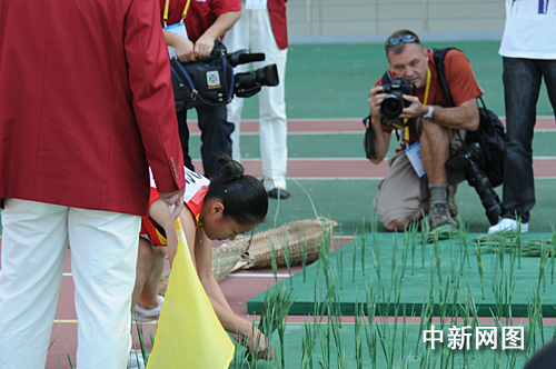 中新網(wǎng)泉州10月28日電 (劉通)今天上午,第六屆全國農(nóng)民運(yùn)動(dòng)會(huì)田徑項(xiàng)目在福建泉州海峽體育中心開賽。圖為專注采訪農(nóng)運(yùn)60米插秧比賽的兩名外國記者。
