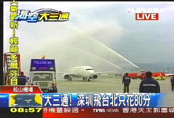 中新網(wǎng)12月15日電 15日上午8時40分,深圳航空ZH9095航班從深圳提前飛抵松山機場,成為兩岸直接“三通”首個抵達臺灣的大陸航班。
