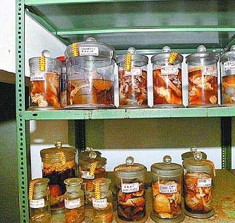 記者通過40米的通道,走到第二棟地勢較低的建筑內(nèi),記者攜帶探照燈,穿過一條白墻走道才轉(zhuǎn)彎進(jìn)入一個房間,抬頭赫見整排約50罐尸罐,嚇得忍不住后退。原來4排鐵架上擺放裝有各種器官和尸塊的罐子,猶如一座人體器官博物館,令人全身起雞皮疙瘩。