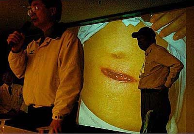 “總統(tǒng)府”發(fā)言人黃志芳(左)及奇美醫(yī)院院長(zhǎng)詹啟賢(右)在記者會(huì)中向民眾說(shuō)明病情。