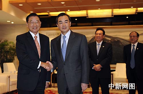 中新網(wǎng)南京4月26日電 (記者 劉舒凌)中共中央臺辦主任王毅今天下午5時許在南京會見;鶗麻L江丙坤率領(lǐng)的協(xié)商代表團一行。