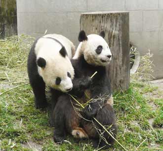 大陸送臺灣的大熊貓?zhí)舆^一劫,團團(左)搶吃圓圓的竹子,十分恩愛。