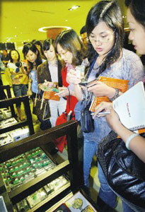 據(jù)悉,踩線團(tuán)成員中大約有四分之一到過臺灣。在參觀完臺北“故宮博物院”后,團(tuán)員們心情愉快,雖被媒體緊盯,仍不影響消費(fèi)力,采買許多“故宮”小飾品。其中,每個100元(新臺幣,下同)仿翠玉白菜吊飾和每個300元的頌壺耳環(huán),很多人一口氣就買五、六個翠玉白菜。
