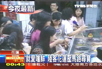 中新網(wǎng)6月18日電 據(jù)臺灣TVBS報道,大陸赴臺游踩線考察團昨天晚上抵達花蓮,不顧先前勞頓,依舊精力旺盛,吃東西、買東西,對花蓮的名產(chǎn)樣樣覺得很新鮮;ㄉ彉I(yè)者半買半送,希望口碑能借由考察團帶回大陸。