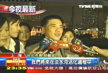 當(dāng)晚外灘鐘聲敲過8點(diǎn)15分,臺(tái)北市長郝龍斌暌違上海3年,再度登船游黃浦江。報(bào)道說,端出臺(tái)灣荔枝招待,上海市安排的游船,連戰(zhàn)夫婦、宋楚瑜夫婦都坐過,為了郝龍斌一行人安全游江,還派出巡邏艇來回護(hù)航。郝龍斌聽著導(dǎo)游介紹外灘的萬國建筑,想的是怎么把外灘移植到臺(tái)北的藍(lán)色公路。